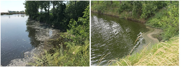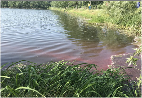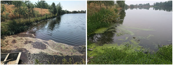 6月14日,治理一月后,水體藻體大量生長,水體刺鼻性氣味消除,水體黑臭得到改善,耐污能力較強的藍藻呈小規(guī)模暴發(fā)態(tài)勢。