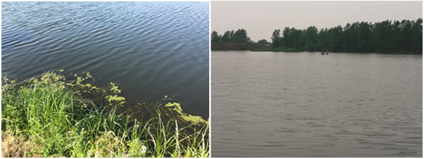 污水塘主要污染為醫(yī)藥化學污染,水體發(fā)黑,完全沒有透明度,惡臭熏人,長約238米,寬約182米,面積約3.3萬平方米,平均水深未知,據(jù)介紹為1米左右,底泥較厚;污水通過西南角污水渠流入水體,污水渠中水色發(fā)黑,透明度約15cm;在南側(cè)偏東位置有一出水閘門,有水流出直接進入河道;北側(cè)偏東位置,有一入水閘門,暫關(guān)停。